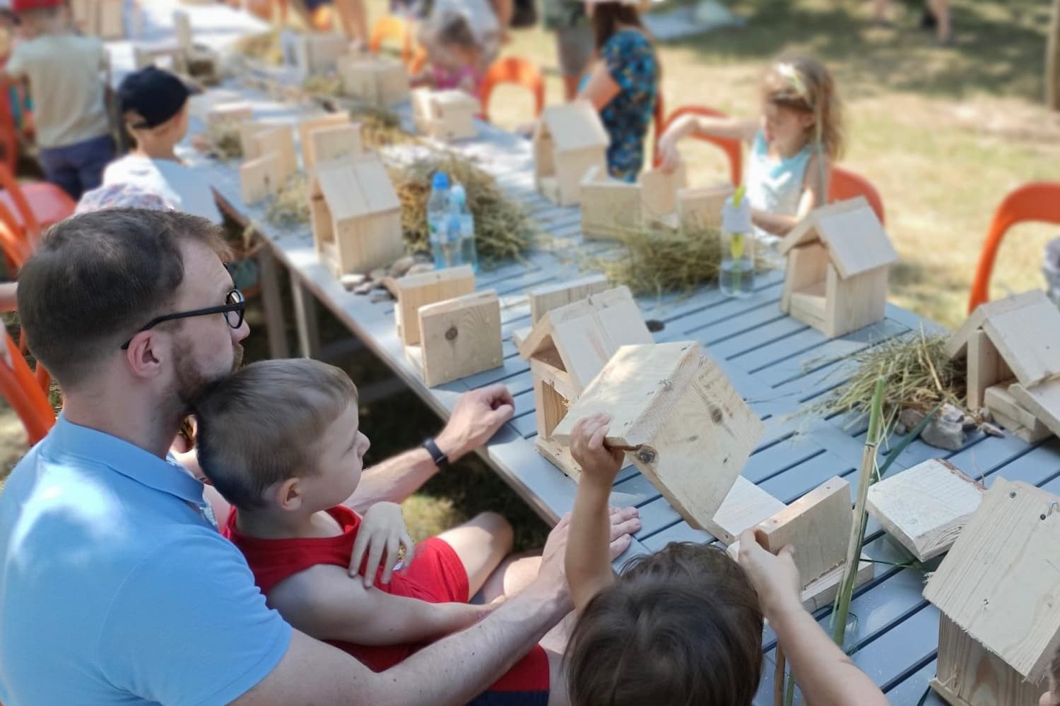 Dzieci z pomocą rodziców przygotowują domki, budki, mikrołąki, karmniki (w zależności od tematu warsztatów) i zabierają je ze sobą do domów