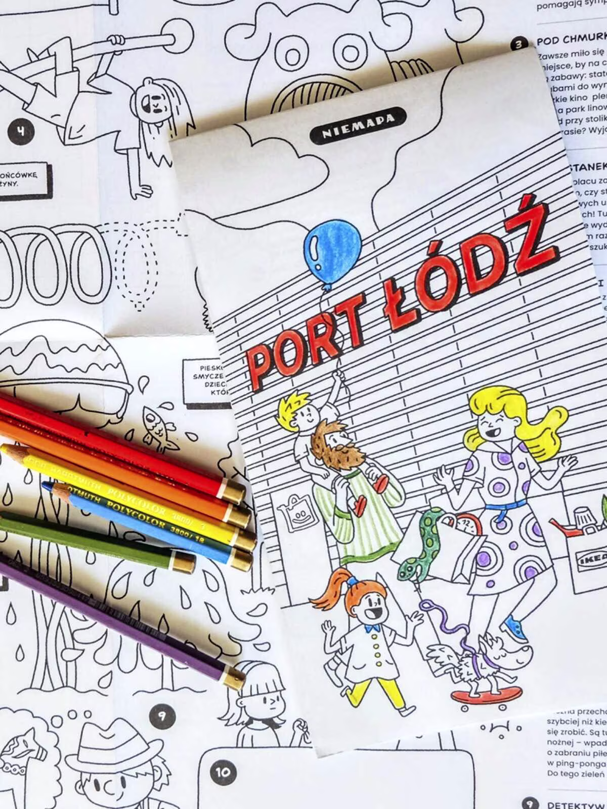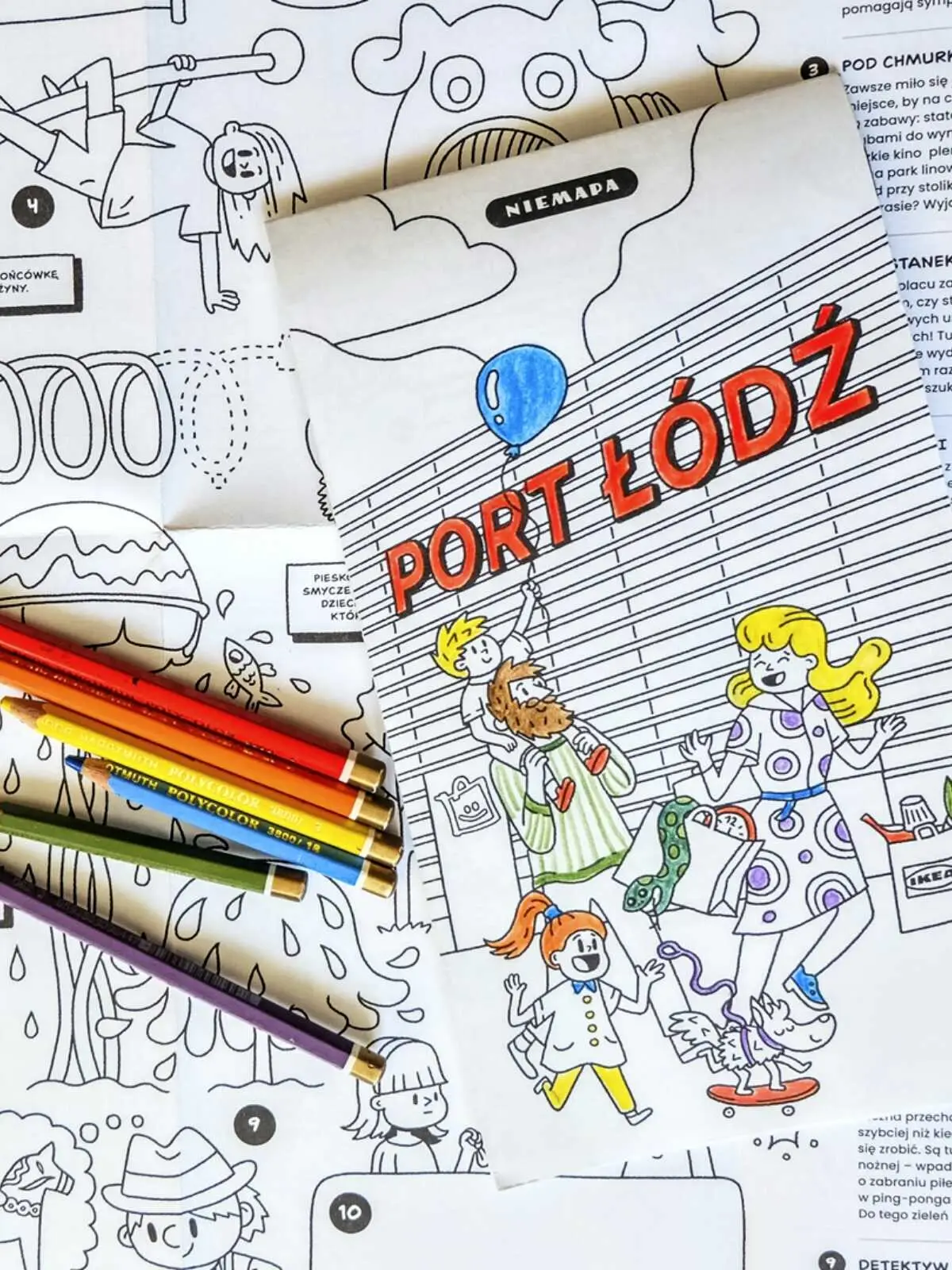 *NIEMAPA Port Łódź to pierwsza wersja tej serii przewodników dla dzieci w formie kolorowanki, która dodatkowo angażuje najmłodszych. NIEMAPĘ stworzył znany i lubiany łódzki ilustrator Tomek Kaczkowski (współautor komiksowej serii dla dzieci “Niezła draka, Drapak!” oraz ilustrator książki dla dzieci "Mat i świat"), który wyrysował mnóstwo atrakcji dla najmłodszych.