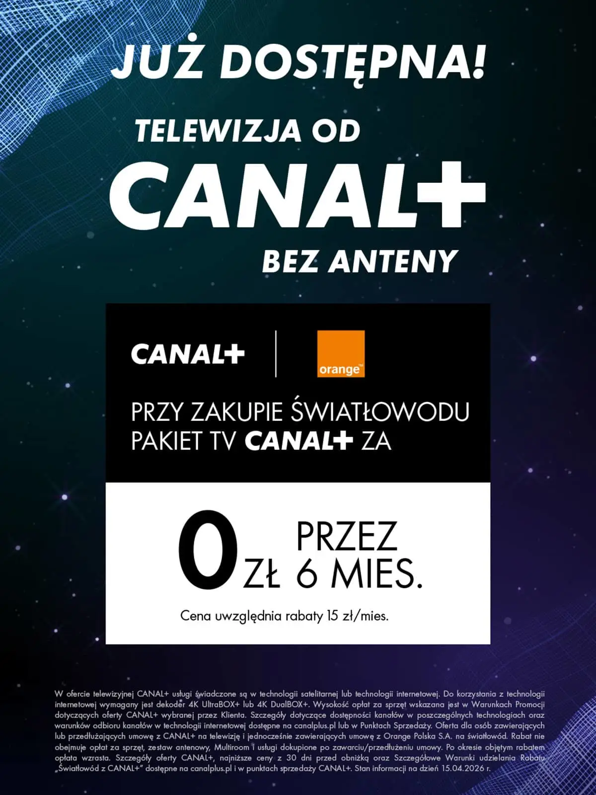 Przy zakupie światłowodu Pakiet TV CANAL+ za 0 zł przez 6 miesięcy (cena uwzględnia rabaty 15 zł/mies.).