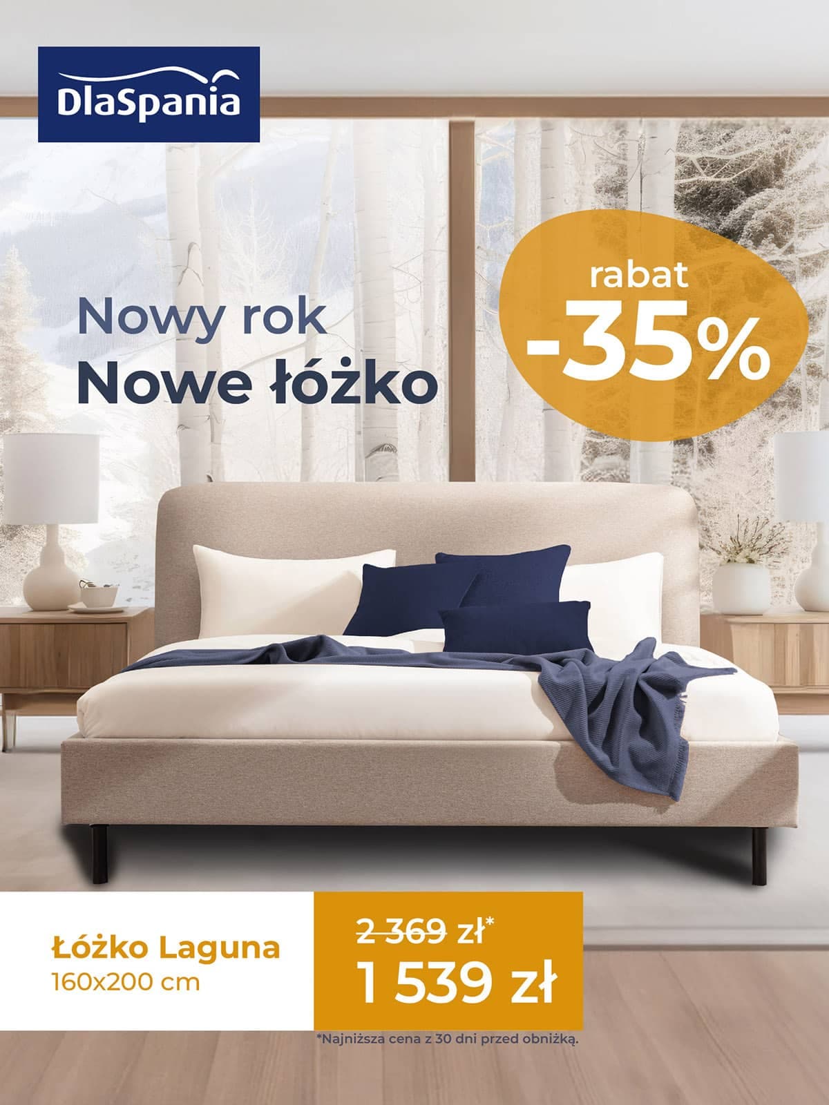 Teraz łóżko Laguna 160×200 tylko 1 539 zł (najniższa cena z 30 dni przed obniżką 2 369 zł). 🛏️