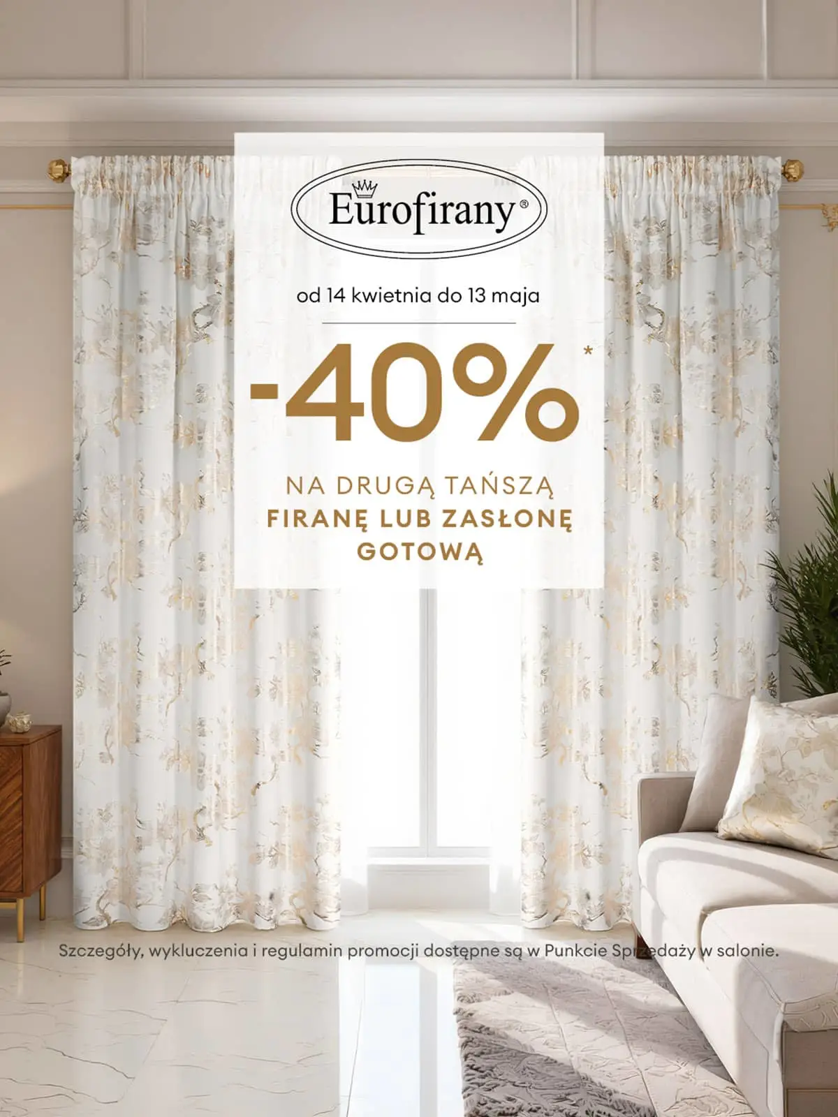 Od 14.04 do 13.05 przy zakupach dwóch firan lub zasłon gotowych -40% rabatu na drugi, tańszy produkt. To idealny moment, by wprowadzić wiosnę do swojego wnętrza.