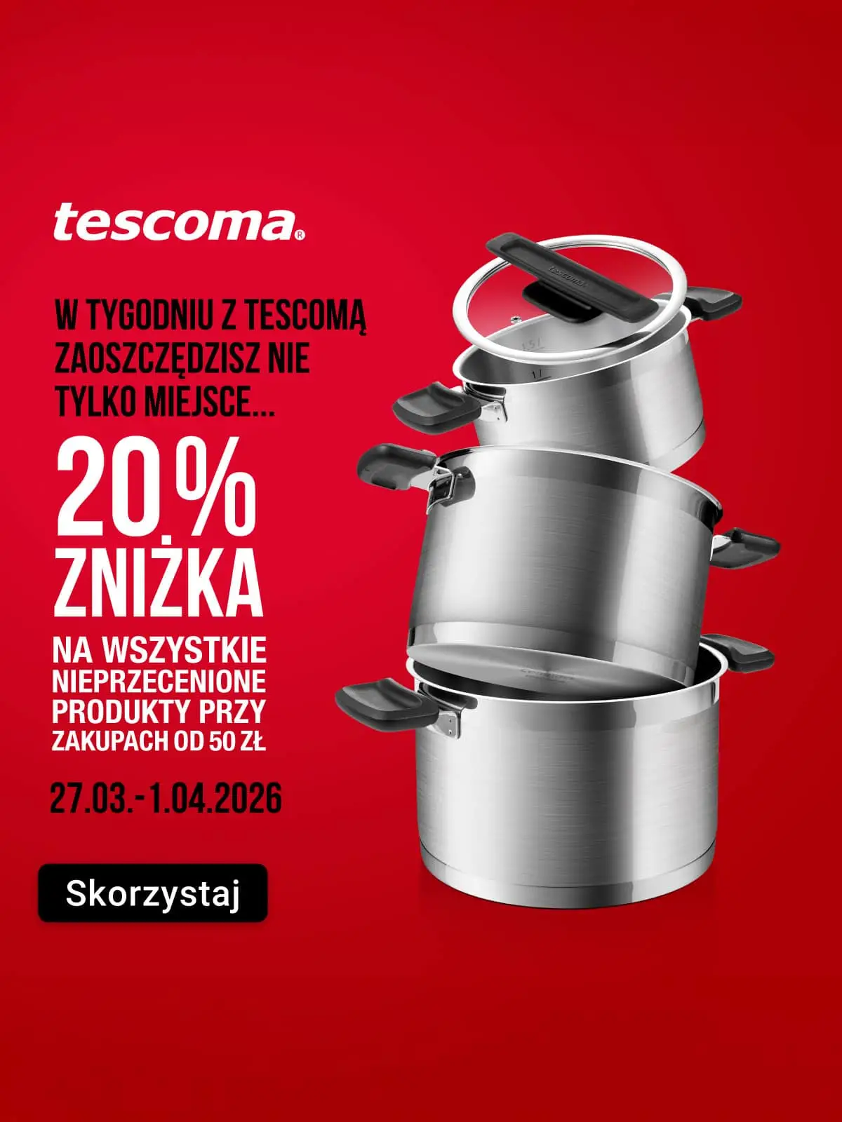 Odwiedź Salon Sprzedaży Tescoma w dniach od 27 marca do 1 kwietnia i zrób zakupy o wartości minimum 50 zł i skorzystaj z 20% rabatu na wszystko.*