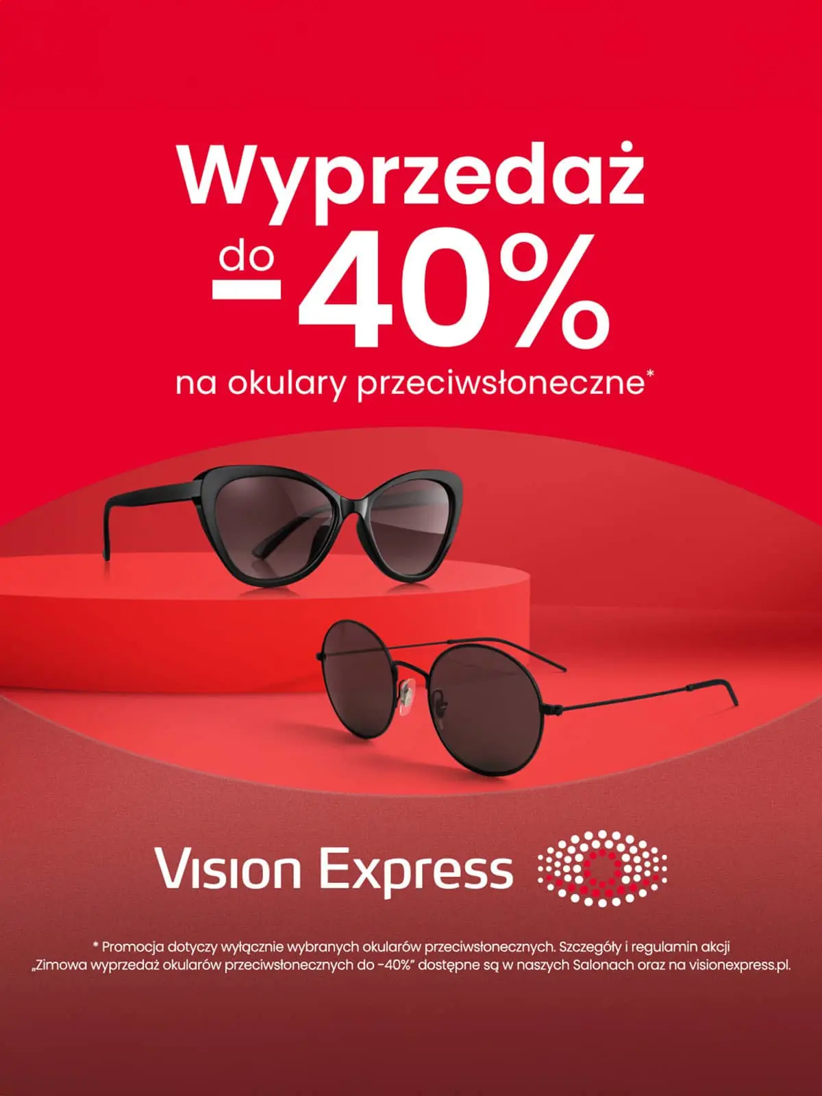 * Promocja dotyczy wyłącznie wybranych okularów przeciwsłonecznych. Szczegóły i regulamin akcji „Zimowa wyprzedaż okularów przeciwsłonecznych do -40%” dostępne są w naszych Salonach oraz na visionexpress.pl.