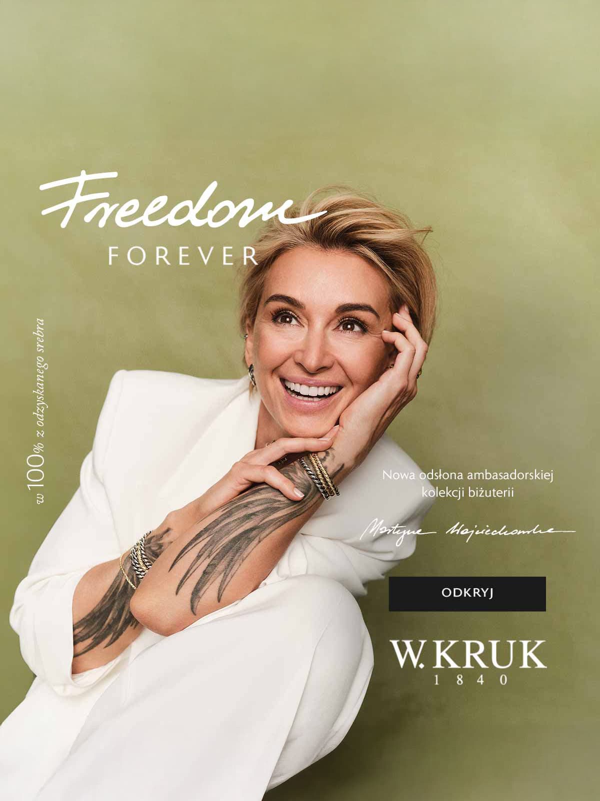 Z okazji 185-lecia W.KRUK celebruje najważniejsze wartości. Marka mogąca poszczycić się największym dorobkiem na polskim rynku jubilerskim, hołduje ponadczasowości, myśli nowocześnie i odpowiedzialnie patrzy w przyszłość. W pierwszej odsłonie celebracji jubileuszowego roku W.KRUK zaprasza do współpracy Martynę Wojciechowską. Martyna, od lat jest uznawana za jedną z najbardziej wpływowych i inspirujących kobiet w Polsce, jest wieloletnią Ambasadorką W.KRUK i współtworzy kolekcję biżuterii Freedom. Autorska kolekcja doczekała się na przestrzeni lat kilku bestsellerowych edycji. W jubileuszowym roku W.KRUK i Martyna przedstawiają najnowszą odsłonę kolekcji biżuterii, która symbolizuje wolność, jako najważniejszą wartość – współcześnie, na przestrzeni lat i na zawsze.